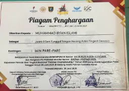 Parepare, 28 Juni 2025 — Semangat juang mahasiswa IAIN Parepare kembali menggemuruh di gelanggang prestasi. Muhammad Irfan Islami, mahasiswa semester 5 Program Studi Pendidikan Bahasa Arab (PBA) Fakultas Tarbiyah, berhasil menorehkan pencapaian membanggakan dengan meraih Juara 2 pada Kejuaraan Pencak Silat Polman Championship 1 yang memperebutkan Piala Kemenpora RI.